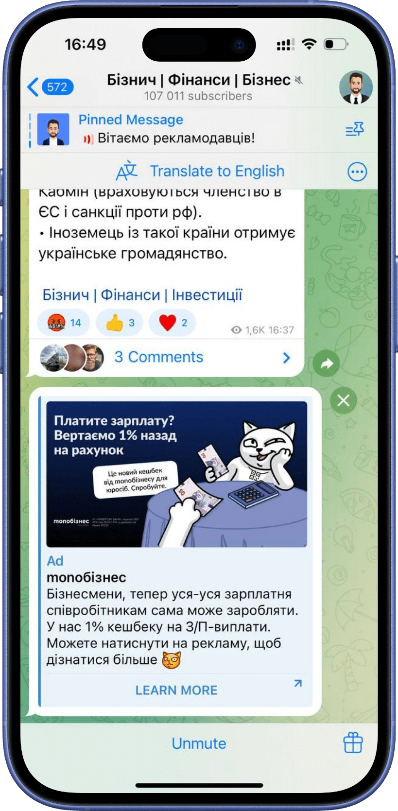 ставка може починатися від 0,25 € за 1000 показів, що дозволяє підлаштувати витрати під ваші можливості: показ реклами в каналах, ботах та навіть у рядку пошуку.